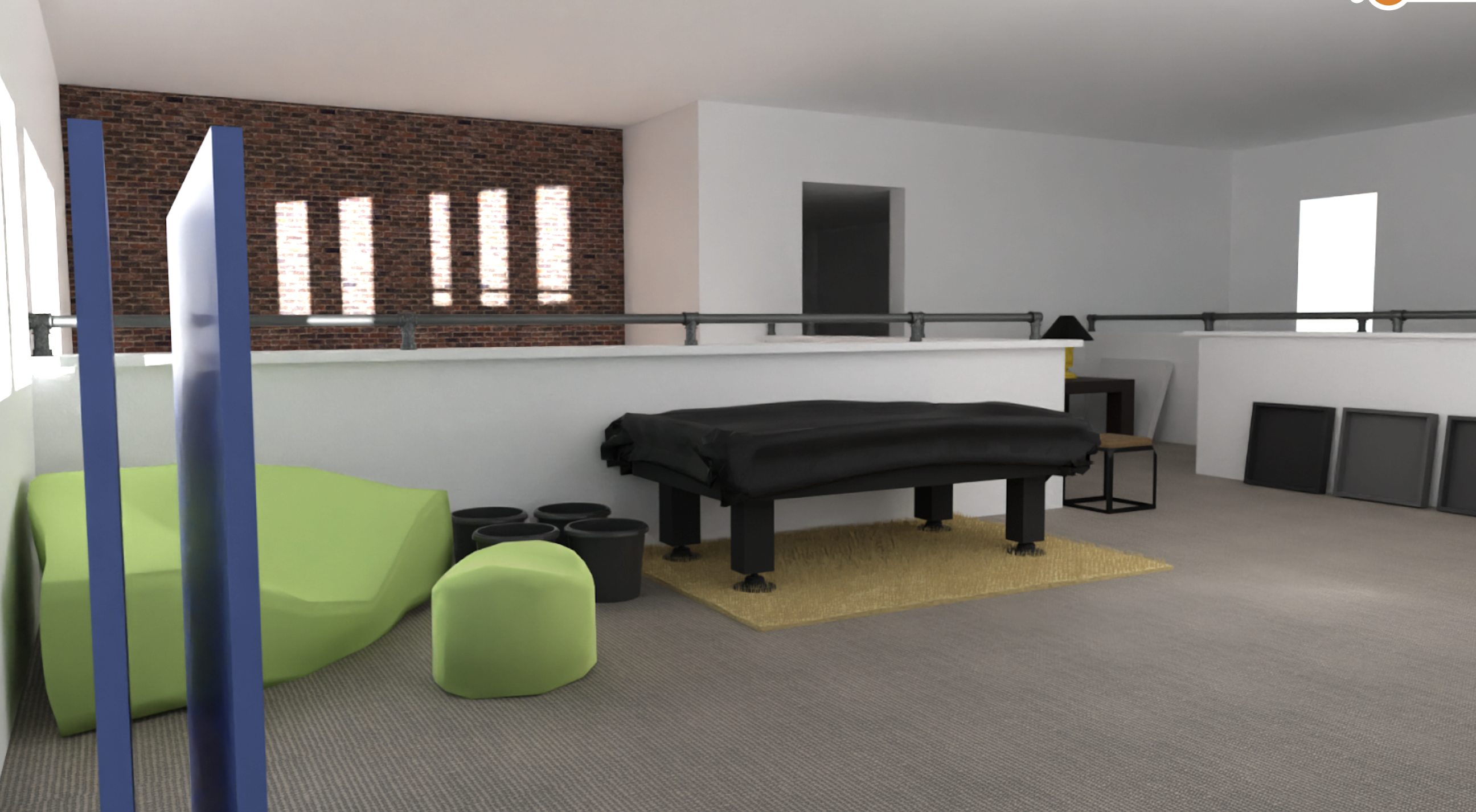 Bean bags as smooth green blobs, pool table as a black slab, windows blown out white. Recognizable, barely.
