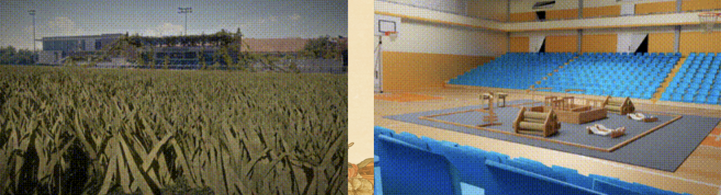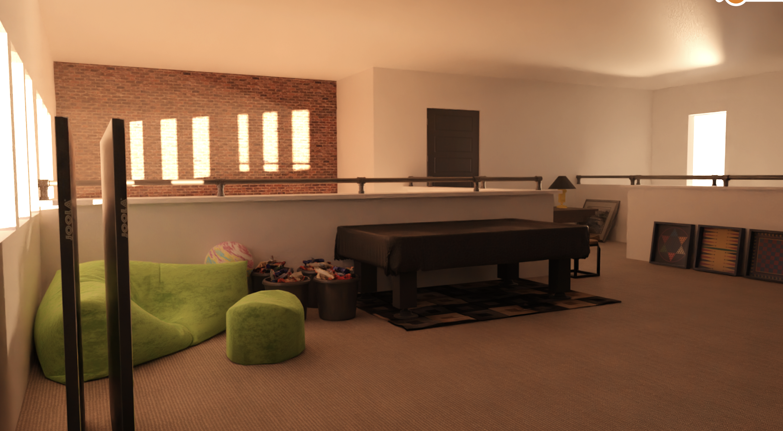 Brick that read as brick, JOOLA stenciled on the net stands, sun rays beaming through the window cutouts and lighting the dust in the air. First time photoreal lighting clicked.