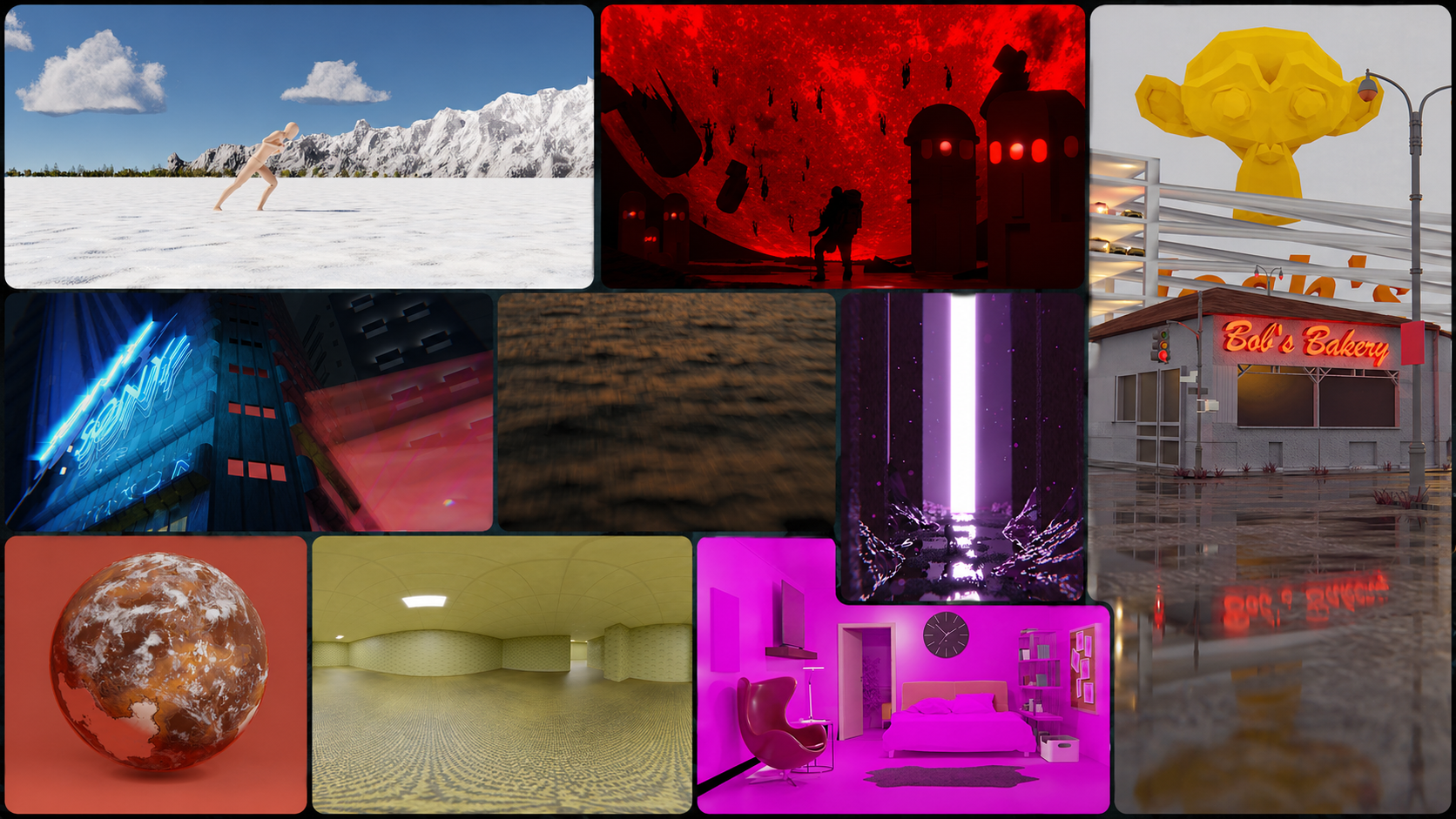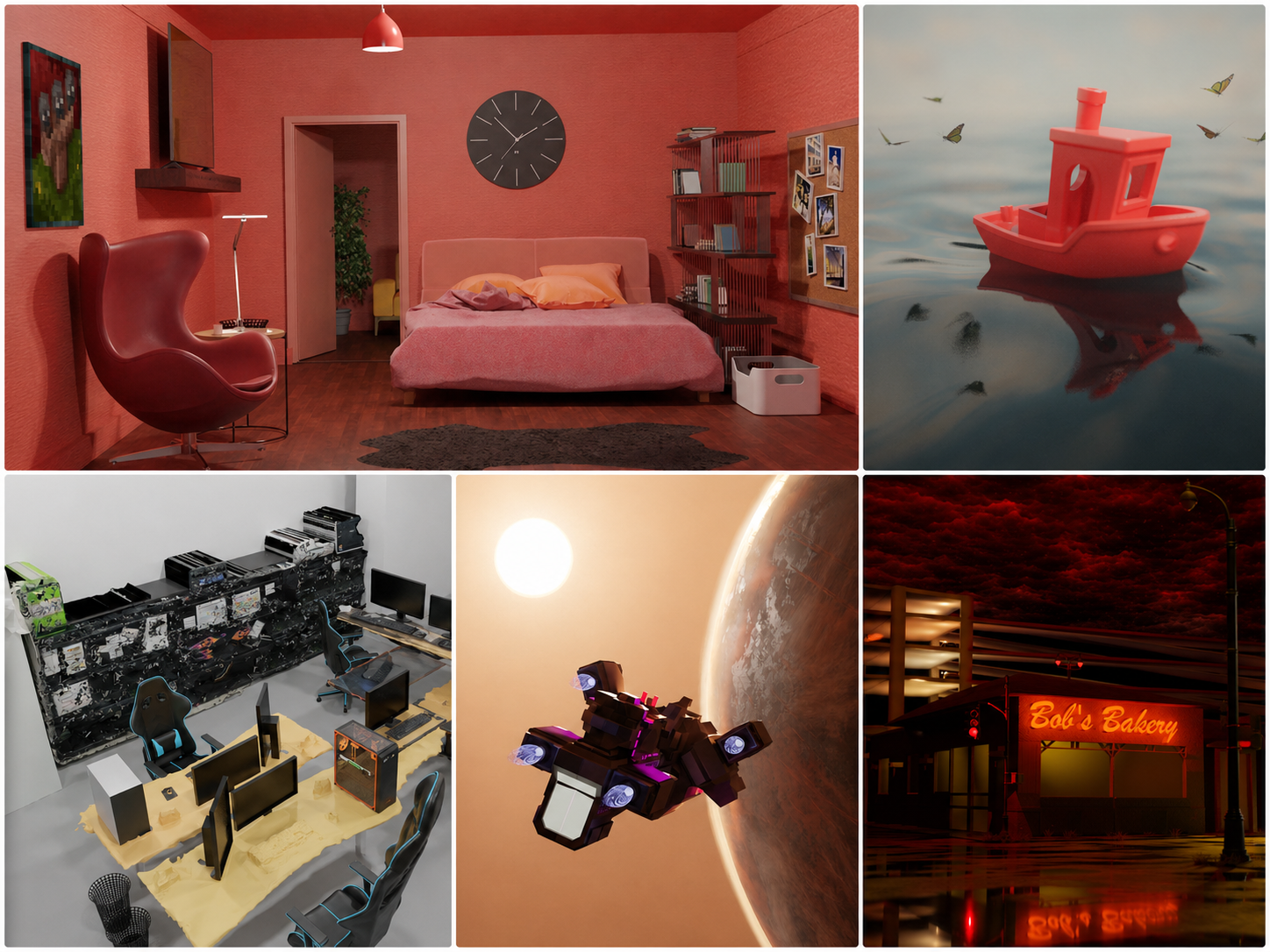 A cluster of early scenes: red bedroom, pink Benchy, marble desk, boxy spaceship, then Bob's Bakery. The bakery was the first one with a real mood: wet street, neon sign, brick.