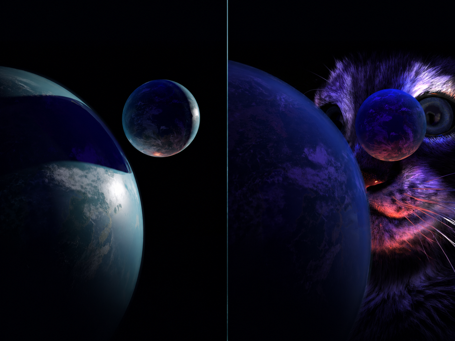 Reflection lesson. The earth on the left, the same earth reflected in the cat's eye on the right. Made me actually understand reflection probes.