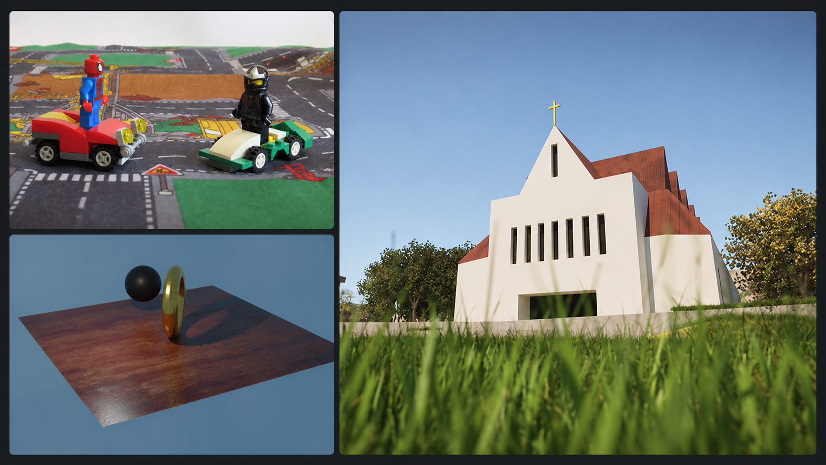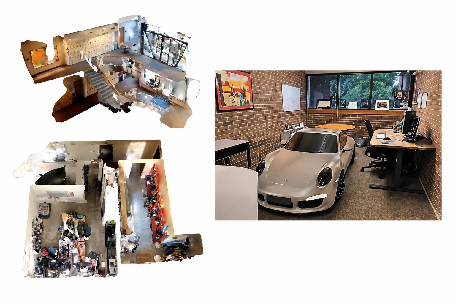 Photographed a messy office floor, dropped a Porsche onto the carpet, matched the lighting until you almost believed it. On the side: point-cloud scans of hallways and storage rooms, just to see what the scanner could and couldn't hold.