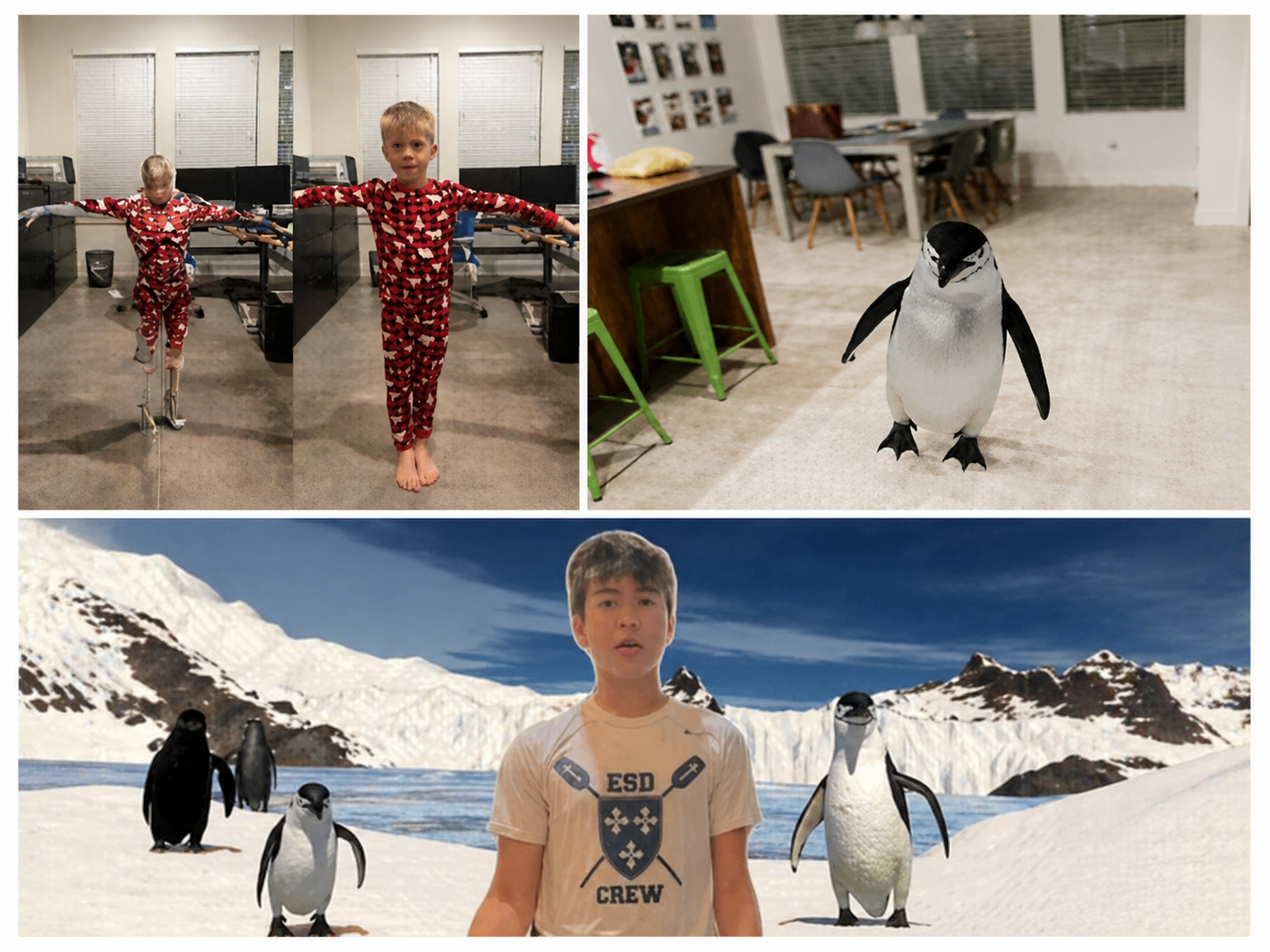 Body tracking on a real kid in red pajamas, then the same kid composited into a snowy 3D environment with penguins. It is exactly as awkward as it sounds, and exactly as much fun.