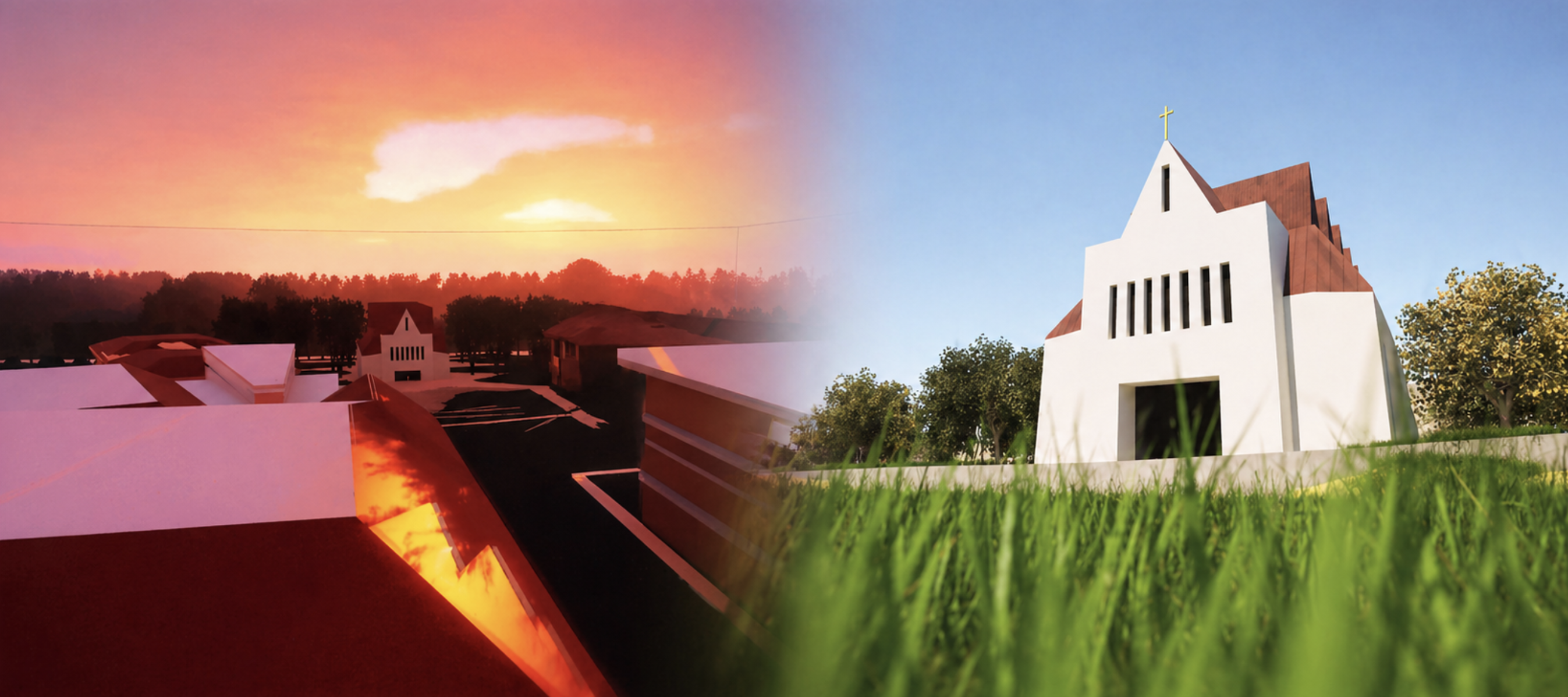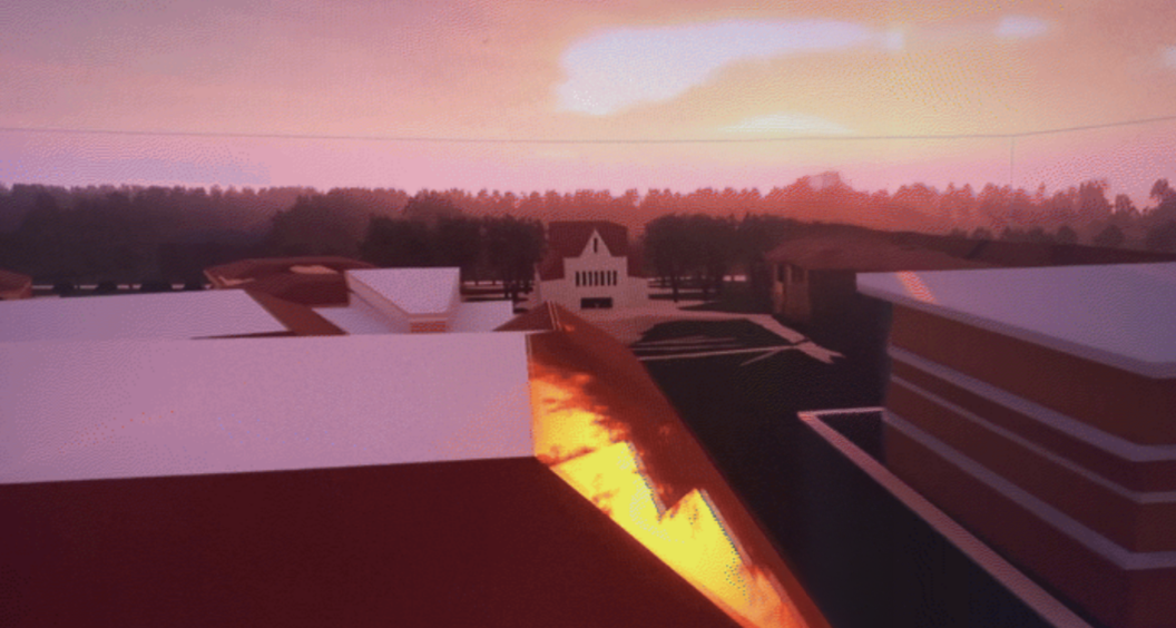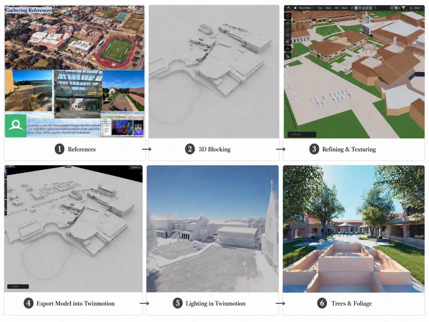 The biggest single project in the whole arc. Walked the campus with a camera, RenderDoc'd a Google Earth frame for the underlying mesh, blocked it out in Blender, textured it, exported to Twinmotion, planted trees by clicking dots on a top-down blueprint until the perimeter filled in.